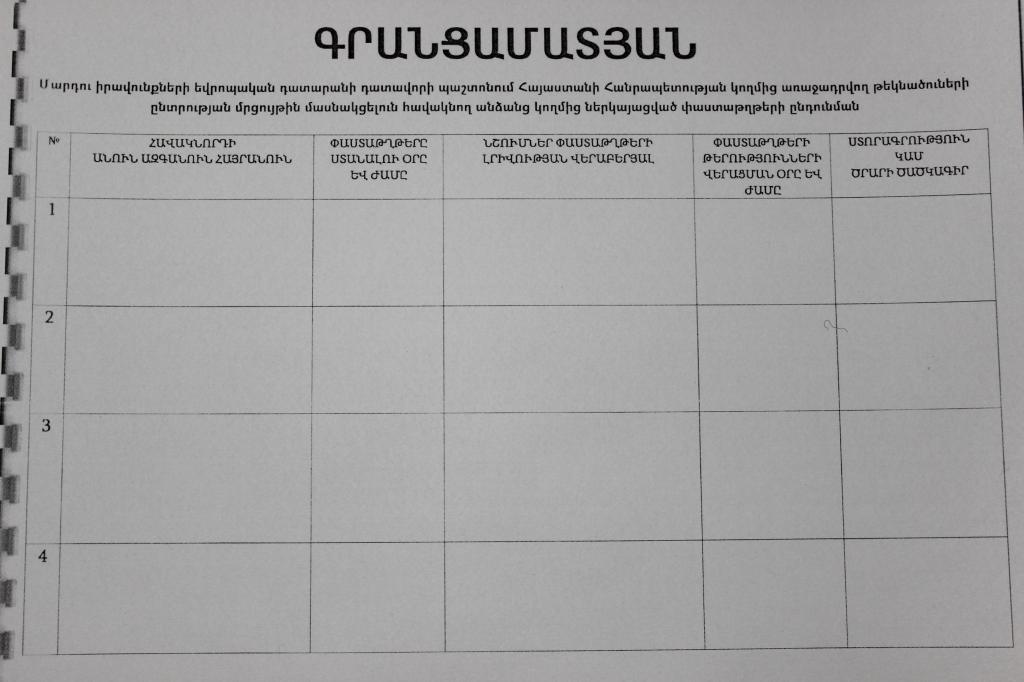 Ներկայացվում են ՄԻԵԴ դատավորի պաշտոնում ՀՀ կողմից առաջադրվող թեկնածուների ընտրությունն իրականացնող մրցութային հանձնաժողովի նիստի արձանագրությունը, որոշումն ու գրանցամատյանը