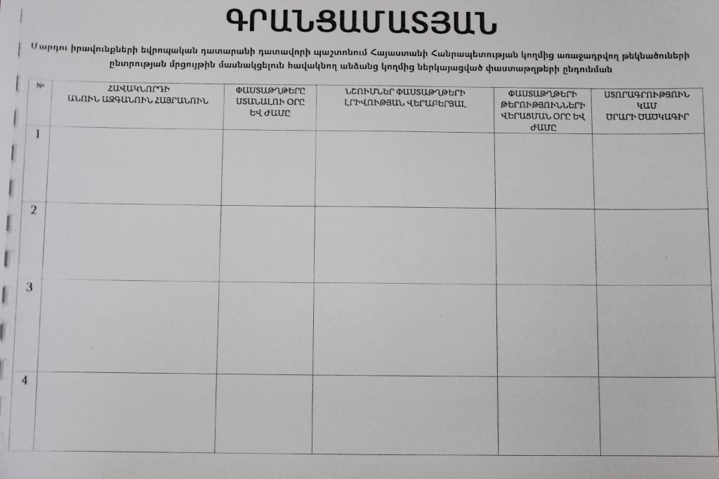 ՄԻԵԴ դատավորի պաշտոնում ՀՀ կողմից առաջադրվող թեկնածուների ընտրության մրցույթին մասնակցելուն հավակնող անձանց կողմից ներկայացված փաստաթղթերի ընդունման գրանցամատյանի լուսապատճենը: