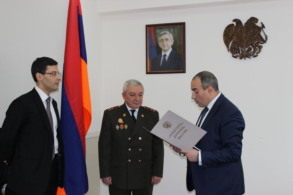 ՀՀ արդարադատության նախարարի տեղակալ Սուրեն Քրմոյանը ՀՀ ԱՆ «Աբովյան» քրեակատարողական հիմնարկի նախկին պետ Արամ Սերգեյի Սարգսյանին հանձնել է ՀՀ արդարադատության նախարարության «Ներսես Շնորհալի» արծաթե հուշամեդալը: Փոխանցելով նախարարի շնորհավորանքը՝ Սուրեն Քրմոյանը շնորհակալություն է հայտնել Արամ Սարգսյանին երկարամյա ծառայության և համակարգում ունեցած ավանդի համար: