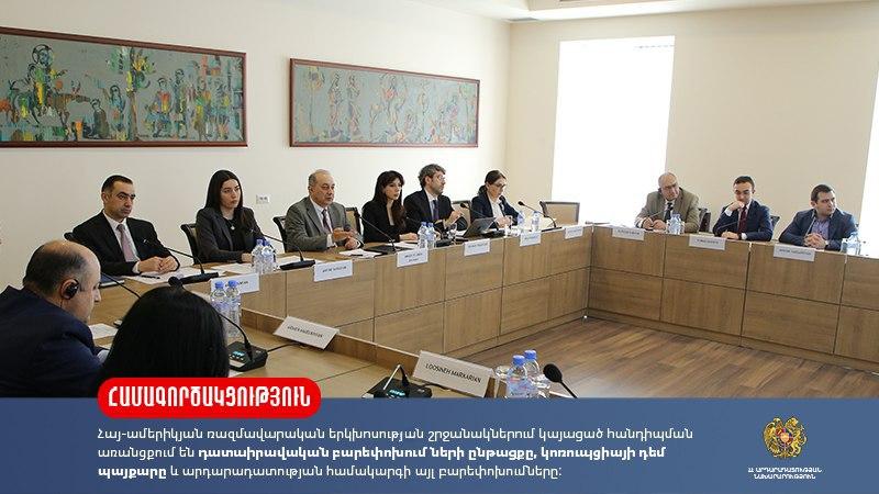 Հայ-ամերիկյան ռազմավարական երկխոսության շրջանակներում կայացած հանդիպման առանցքում են դատաիրավական բարեփոխումների ընթացքը, կոռուպցիայի դեմ պայքարը և արդարադատության համակարգի այլ բարեփոխումները:
