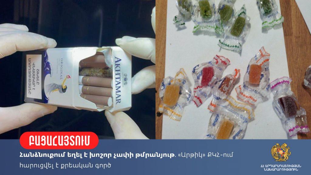 Ապրիլի 14-ին՝ ժամը 16:35-ի սահմաններում, Արդարադատության նախարարության «Արթիկ» քրեակատարողական հիմնարկի օպերատիվ բաժնի ծառայողներն, իրացնելով ստացված տեղեկությունները, խուզարկության են ենթարկել քաղաքացի Է. Մ.-ի կողմից բերված հանձնուքը: Արդյունքում նկատել են, որ հանձնուքում եղած թվով 5 կոնֆետների գործարանային փաթեթավորումը խախտված է, իսկ դրանցից երկուսի մեջ ակնհայտ երևում են կասկածելի զանգվածներ:
