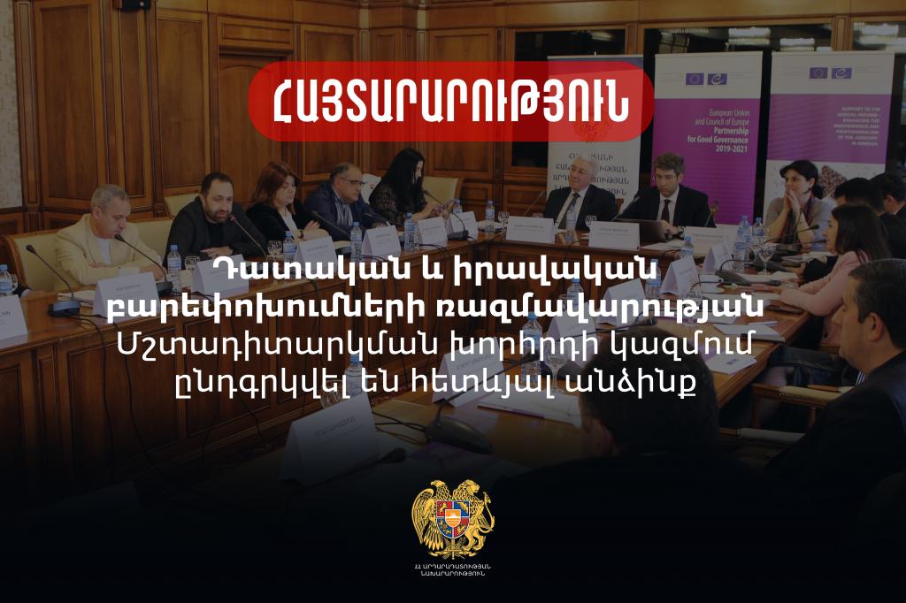 Արդարադատության նախարարությունն ամփոփում է Դատական և իրավական բարեփոխումների 2022-2026 թվականների ռազմավարության և դրանից բխող գործողությունների ծրագրի կատարման Մշտադիտարկման խորհրդի կազմում ընդգրկվելու համար հայտարարված մրցույթի արդյունքները: