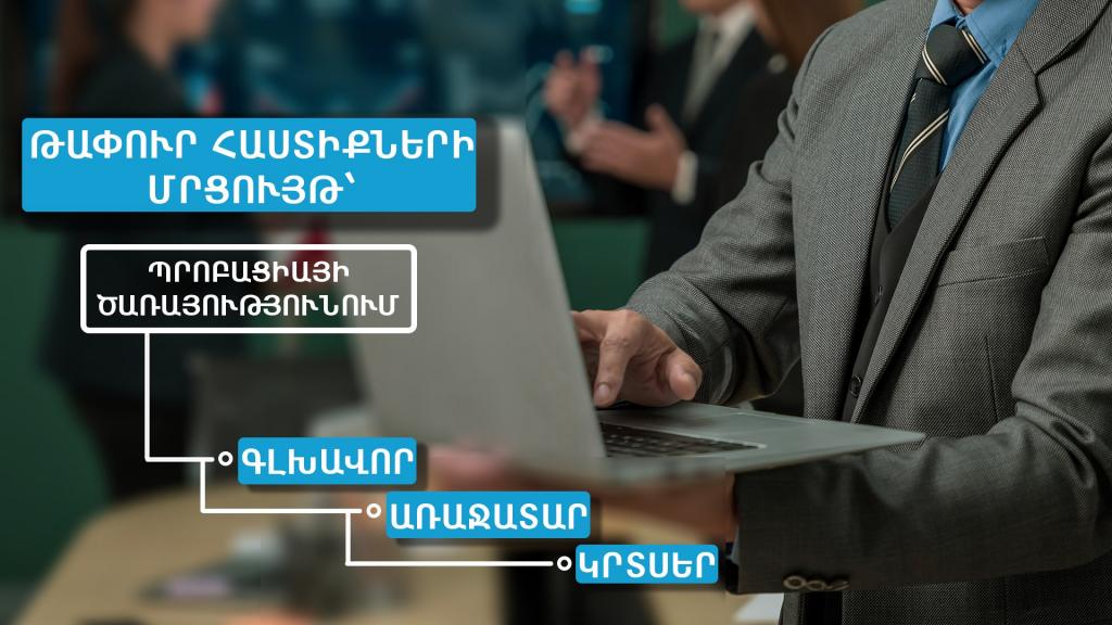 Արդարադատության նախարարության Պրոբացիայի ծառայությունը հայտարարում է կենտրոնական և տարածքային ստորաբաժանումների գլխավոր, առաջատար և կրտսեր խմբերի թափուր պաշտոնները համալրելու մրցույթ: