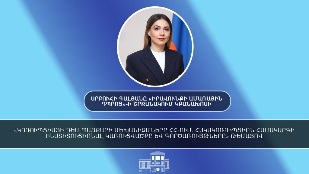 Արդարադատության նախարար Սրբուհի Գալյանը հանդես կգա «Կոռուպցիայի դեմ պայքարի մեխանիզմները ՀՀ-ում․ Հակակոռուպցիոն համակարգի ինստիտուցիոնալ կառուցվածքը և գործառույթները» թեմայով բանախոսությամբ։