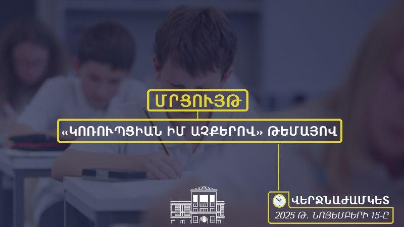 Կոռուպցիայի դեմ պայքարի օրվան ընդառաջ ՀՀ արդարադատության նախարարությունը հայտարարում է տեսահոլովակների մրցույթ՝ «Կոռուպցիան իմ աչքերով» թեմայով։ Մրցույթին կարող են մասնակցել ՀՀ հանրակրթական դպրոցների 10-12-րդ դասարանի աշակերտները և ուսանողները։ Մասնակցությունը կարող է լինել ինչպես անհատական, այնպես էլ խմբային։ Մրցույթի մասնակիցները պետք է պատրաստեն և ներկայացնեն տեսահոլովակ կամ անիմացիոն հոլովակ, որտեղ կարտացոլեն՝ ․ Կոռուպցիայի բացասական հետևանքները, ․ Կոռուպցիայի ազդեցությունը հասարակության վրա։ Մրցույթի նպատակն է բարձրացնել անչափահասների իրավագիտակցությունը և ձևավորել զրո հանդուրժողականություն կոռուպցիայի նկատմամբ։ Տեսահոլովակները պետք է ուղարկել մինչև 2025 թվականի նոյեմբերի 15-ը հետևյալ էլ. հասցեին՝ info@moj.am