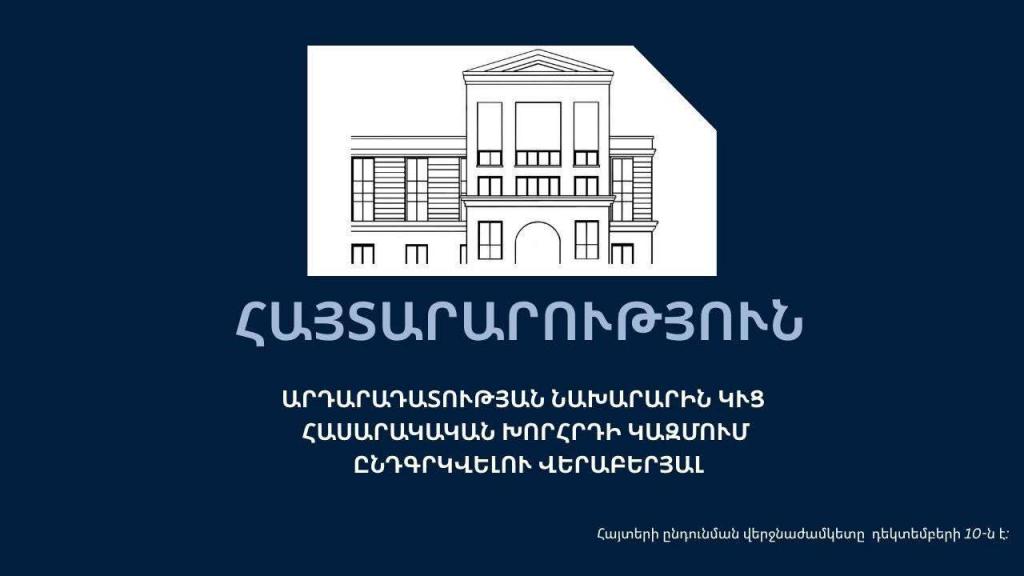 Արդարադատության նախարարությունը մշտապես կարևորելով հասարակական կարծիքը և քաղաքացիական հասարակության դերակատարումը Արդարադատության նախարարության ոլորտային բարեփոխումների գործընթացներում՝ հայտարարում է Նախարարին կից հասարակական խորհրդի ձևավորման մրցույթ: Խորհրդի նպատակն է ապահովել Արդարադատության նախարարության խնդիրների և նպատակների իրականացման ընթացքում քաղաքացիական հասարակության մասնակցությունը, ներառական որոշումներ կայացնելուն նպաստող կենսունակ միջավայրի ձևավորումը, մասնակցային կառավարումը խրախուսելու և շահառու խմբերին քաղաքականության մշակմանը մասնակցելու գործընթացին ներգրավումը: