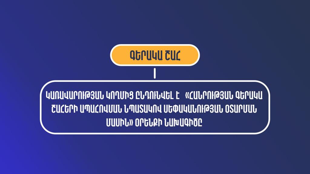 Կառավարության այսօրվա նիստում չզեկուցվող հարցերի փաթեթով ընդունվել է «Հանրության գերակա շահերի ապահովման նպատակով սեփականության օտարման մասին» օրենքում և հարակից օրենքներում փոփոխություններ և լրացումներ կատարելու նախագիծը։