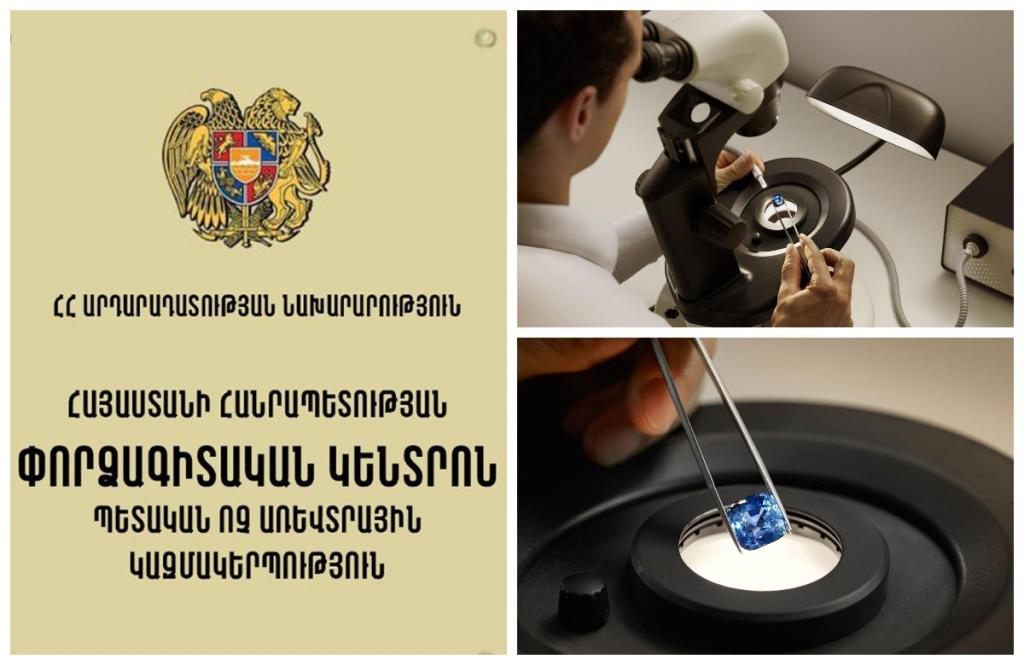 Согласно постановлению Правительства Республики Армения в ГНКО "Экспертный центр" Министерства юстиции Республики Армения будут осуществляться также следующие экспертизы: 1. экспертизы драгоценных металлов и драгоценных камней и поступающих в государственную казну драгоценных металлов, драгоценных камней и изделий из них, обеспечение 2 качественных оценок и проведение контрольных анализов драгоценных металлов, а также определение названия драгоценных камней и обеспечение их качественной оценки, экспертизы драгоценных металлов, драгоценных камней и изделий из них, осуществляемые на основании решений, принятых государственными органами и судами; 2. обеспечение оценки и проведение контрольных анализов драгоценных металлов, а также определение названия драгоценных камней и обеспечение их качественной оценки, экспертизы драгоценных металлов, драгоценных камней и изделий из них, осуществляемые на основании решений, принятых государственными органами и судами; 3. рыночная оценка поступающих в казну и выпускаемых из казны драгоценных металлов, драгоценных камней и изделий из них; 4. экспертизы музейных образцов и архивных ценностей, содержащих драгоценные металлы и драгоценные камни.