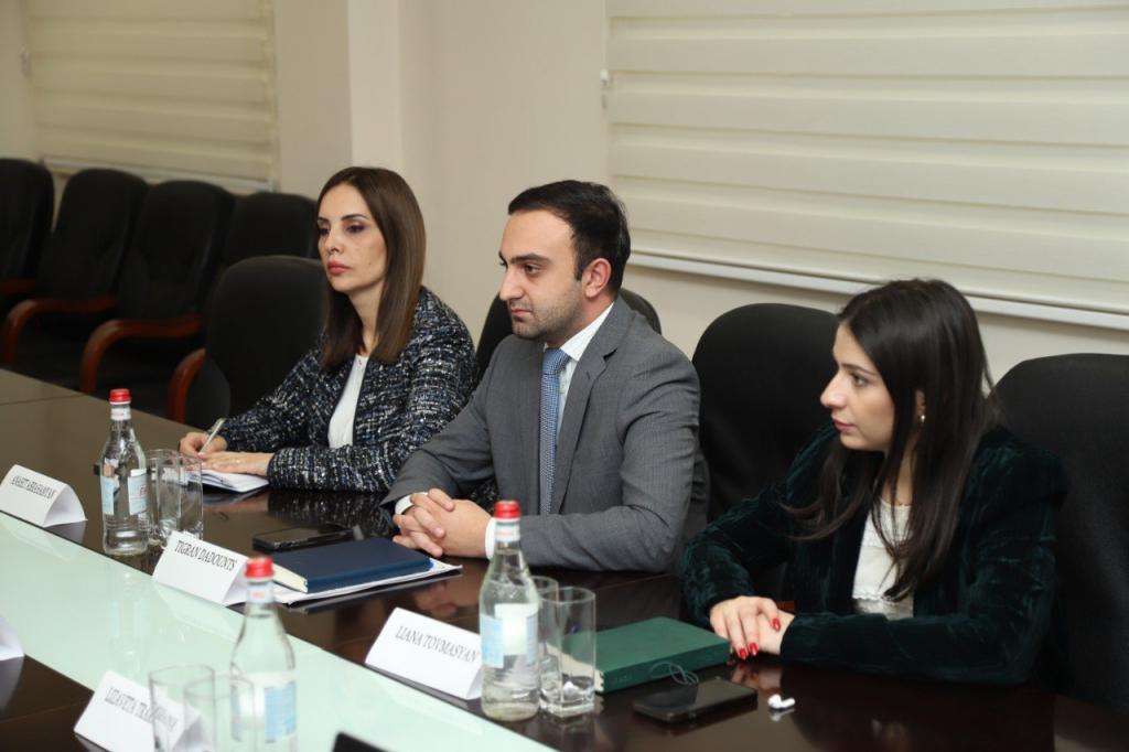 Директор фонда "Центр развития законодательства" Министерства юстиции Тигран Дадунц, начальник департамента международного правового сотрудничества Министерства юстиции Анаит Абраамян, советник министра юстиции Лиана Товмасян приняли делегацию, возглавляемую Эстер Кутанш — ответственным по вопросам руководства работой Банка, направленной на укрепление экономического управления и инвестиционной среды в регионах Центральной Азии, Европы и Кавказа.