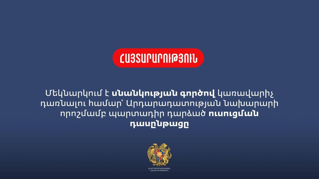 ГНКО "Центр правового образования и реализации реабилитационных программ" Министерства юстиции объявляет прием на курс обучения претендентов на участие в проверке квалификации управляющего по делам банкротства, по окончании которого участникам курса будет вручен сертификат. Окончательный срок подачи заявлений — 25 августа 2023 года включительно. Для подробных сведений просим пройти по следующей ссылке — https://www.moj.am/announcements/view/article/2556.