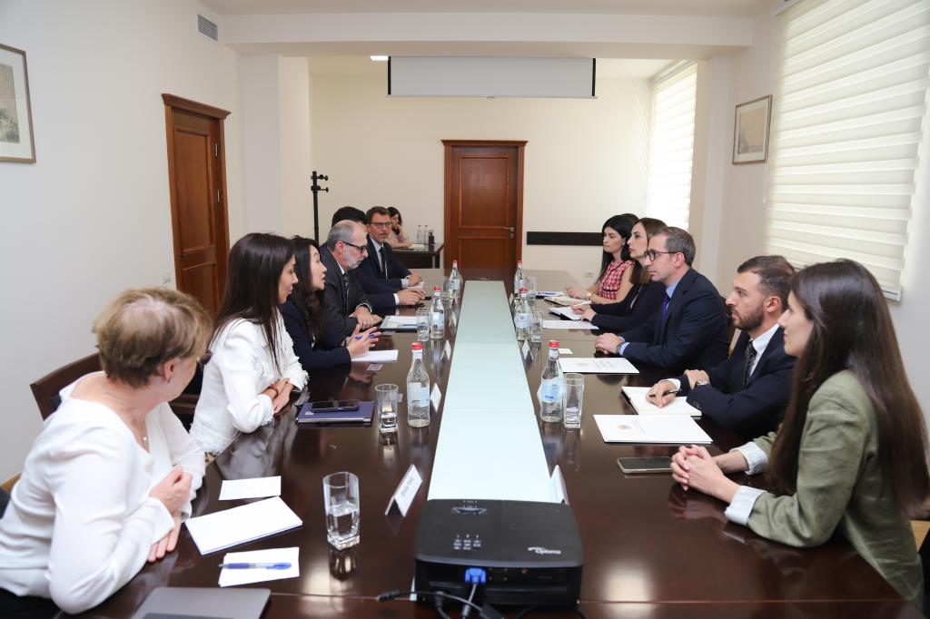Заместитель министра юстиции Карен Карапетян принял делегацию, возглавляемую заместителем главного юрисконсульта Азиатского банка развития (АБР) Демианом Истманом. Заместитель министра поблагодарил АБР за содействие, проявленное в процессе организации международной арбитражной конференции, проведенной в Армении. Представители Азиатского банка развития и ее постоянной миссии в Армении в свою очередь подчеркнули важность двустороннего сотрудничества в сфере правосудия, в процессе улучшения инвестиционной среды в Армении. В ходе встречи стороны обсудили новые пути сотрудничества между Министерством юстиции и Азиатским банком развития в сфере Службы пробации, судебно-правовой сфере, сфере борьбы с коррупцией, а также в сфере цифровизации. Обсуждалась также возможность осуществления совместных работ, направленных на эффективность организации профессиональных курсов и иных учебных программ и повышение потенциала в сфере медиации. В завершение встречи Карен Карапетян наградил старшего юрисконсульта Азиатского банка развития Кристину Пак и старшего специалиста по инвестициям постоянной миссии АБР в Армении Нарине Аветисян почетными грамотами.