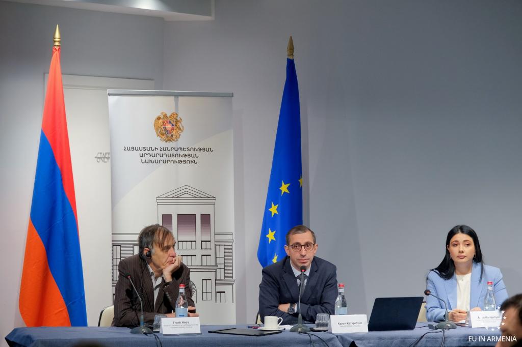 Под руководством заместителя Министра юстиции Карена Карапетяна состоялась конференция международного координационного партнерства по поддержке реформ сферы юстиции. Целью конференция было представить международным партнерам прогресс в реформировании сферы, предполагаемые действия и их приоритетность, рассмотреть направления оказания поддержки международными партнерами и возможности расширения мер, направленных на развитие сферы. В мероприятии со вступительным словом выступил руководитель отдела сотрудничества делегации ЕС Франк Гесс, который высоко оценил повестку реформ, проводимых в сфере правосудия, и применение в этом процессе международных стандартов. Он подчеркнул важность сотрудничества с Министерством в различных форматах, в том числе посредством программ бюджетной поддержки. В своей речи Карен Карапетян приветствовал работу с международными партнерами в различных стратегических сферах и поблагодарил за оказанную поддержку организации, осуществляющие международную миссию в Армении. Заместитель Министра представил реализуемые совместно с международными партнерами программы и их результаты, в том числе законодательные и институциональные изменения. Были представлены реформы, зарегистрированные за последний год в сфере правосудия, в сфере защиты прав человека, антикоррупционной, судебно-правовой, уголовно-исполнительной сфере и сфере пробации, а также цифровизации. Во второй части конференции разделенные по сферам рабочие группы обсудили отраслевые потребности по стратегическим направлениям и перспективы направленного на их реализацию содействия международных партнеров. С международными партнерами были достигнуты договоренности о продолжении обсуждений по внедрению намеченных отраслевых программ, а также других возможностей сотрудничества.