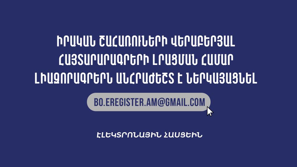 Сообщаем, что до 20 февраля каждого года юридические лица обязаны представлять в Агентство государственного регистра юридических лиц подтверждение того, что представленная о реальных бенефициарах последняя декларация содержит актуальные по состоянию на 31 декабря предыдущего года сведения либо измененные сведения о реальных бенефициарах юридического лица. В случае представления декларации о реальных бенефициарах в Агентство государственного регистра юридических лиц Министерства юстиции Республики Армения (через сайт https://bo.e-register.am) уполномоченными лицами, просьба отправить доверенность в Агентство по электронной почте на адрес: bo.eregister.am@gmail.com.