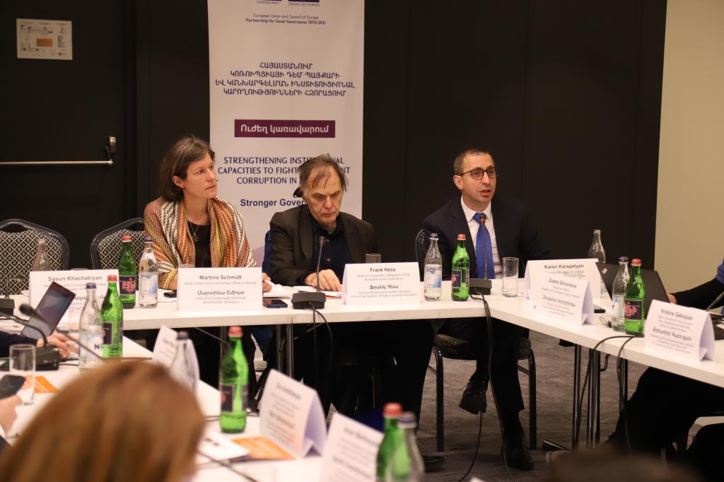 Karen Karapetyan made an opening speech and emphasized the multi-sectoral cooperation between the EU/CoE-Ministry of Justice. According to the deputy minister, the goal of the program is to support anti-corruption reforms in the country.