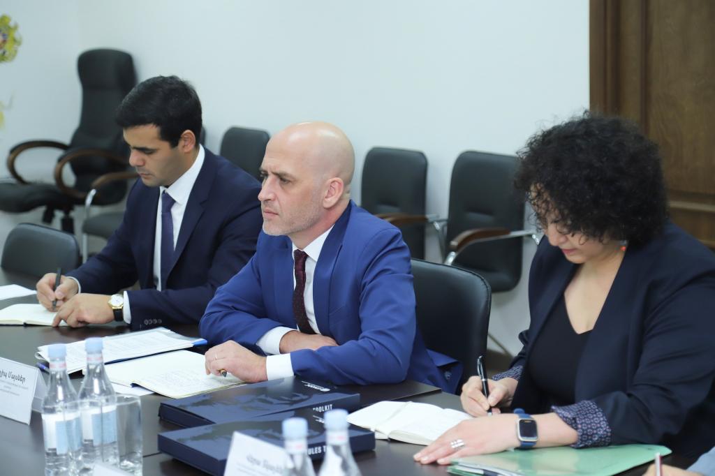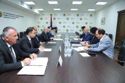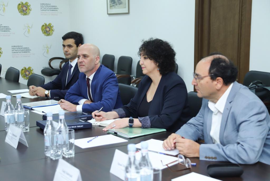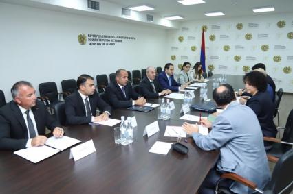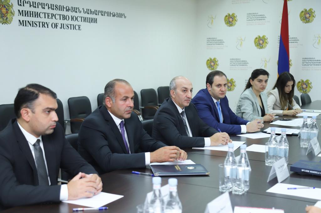 Deputy Minister of Justice Levon Balyan received a delegation implementing a needs assessment mission in the sphere of penitentiary and prison reforms on behalf of the United Nations Office on Drugs and Crime. During the discussion, Levon Balyan noted that, in the context of the ongoing judicial-legal reforms, special importance is attached to the effective protection of the rights and lawful interests of persons serving punishment, as well as the creation of guarantees for them. Presenting the reforms implemented by the Ministry of Justice in the probation and penitentiary sectors, the Deputy Minister emphasised that the Government of the Republic of Armenia has adopted a new approach in the criminal justice sector, that is, the transition from punitive policy to re-socialisation and restorative justice. The Deputy Minister indicated improvement of the legislative framework, modernisation of the infrastructures and facilities of penitentiary institutions and probation in line with European standards, introduction of new mechanisms for electronic management systems and improvement of the security system among the priorities of the Ministry of Justice. UNODC Inter-Regional Advisor Philipp Meissner and Crime Prevention and Criminal Justice Officer Vera Tkachenko expressed gratitude for the meeting and attached special importance to the political will and willingness of Armenia from the perspective of solutions to the sector-specific issues. During the meeting, the international colleagues expressed their concerns and received answers to their questions. First Deputy Head of the Penitentiary Service Sahak Grigoryan; Deputy Head of the Probation Service Gurgen Afrikyan; Director of the "Legal Education and Rehabilitation Programmes Implementation Centre" SNCO Hayk Sanoyan; Head of Staff of the Penitentiary Service Artak Sargsyan and Head of the UN and Sustainable Development Division of the Department of Multilateral Policy and Development Cooperation of the Ministry of Foreign Affairs Davit Manukyan were also attending the meeting.