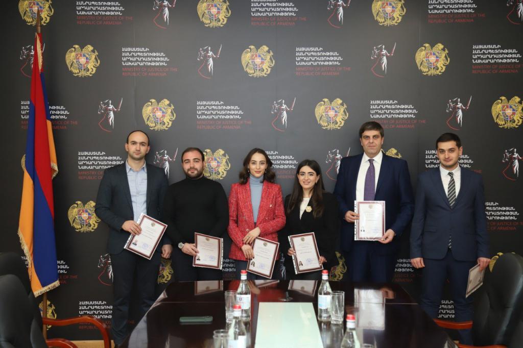 Заместитель министра юстиции Арменуи Арутюнян поздравила и вручила сертификаты шестерым лицам, преодолевшим двухэтапную проверку квалификации управляющего по делу о банкротстве.