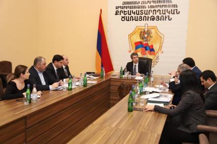 Министр юстиции Григор Минасян, заместитель министра Левон Балян посетили центральный орган Уголовно-исполнительной службы для обсуждения запланированных на первый квартал 2023 года работ.