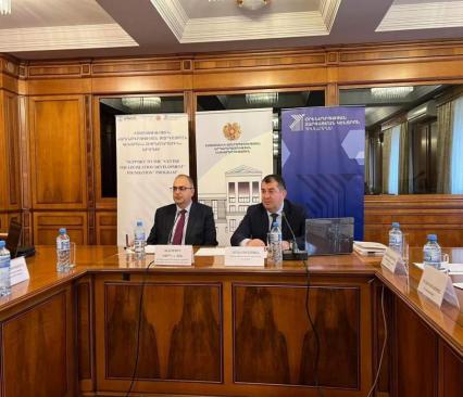 В Цахкадзоре заместитель Министра юстиции Ара Мкртчян и председатель Постоянной комиссии Национального Собрания по государственно-правовым вопросам Владимир Варданян выступили со вступительной речью на рабочем обсуждении на тему "Об основных вопросах введения в действие Уголовного кодекса и Уголовно-процессуального кодекса Республики Армения и их законодательные и институциональные перспективы решения".