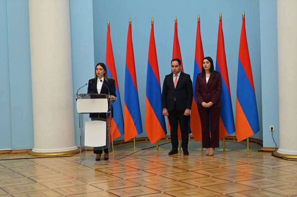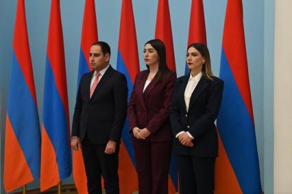 Высокому званию члена Правительства принесли присягу также министр МТУИ Давид Худатян и министр внутренних дел Арпине Саргсян. Торжественная церемония присяги была завершена поздравлениями Премьер-министра и Президента.